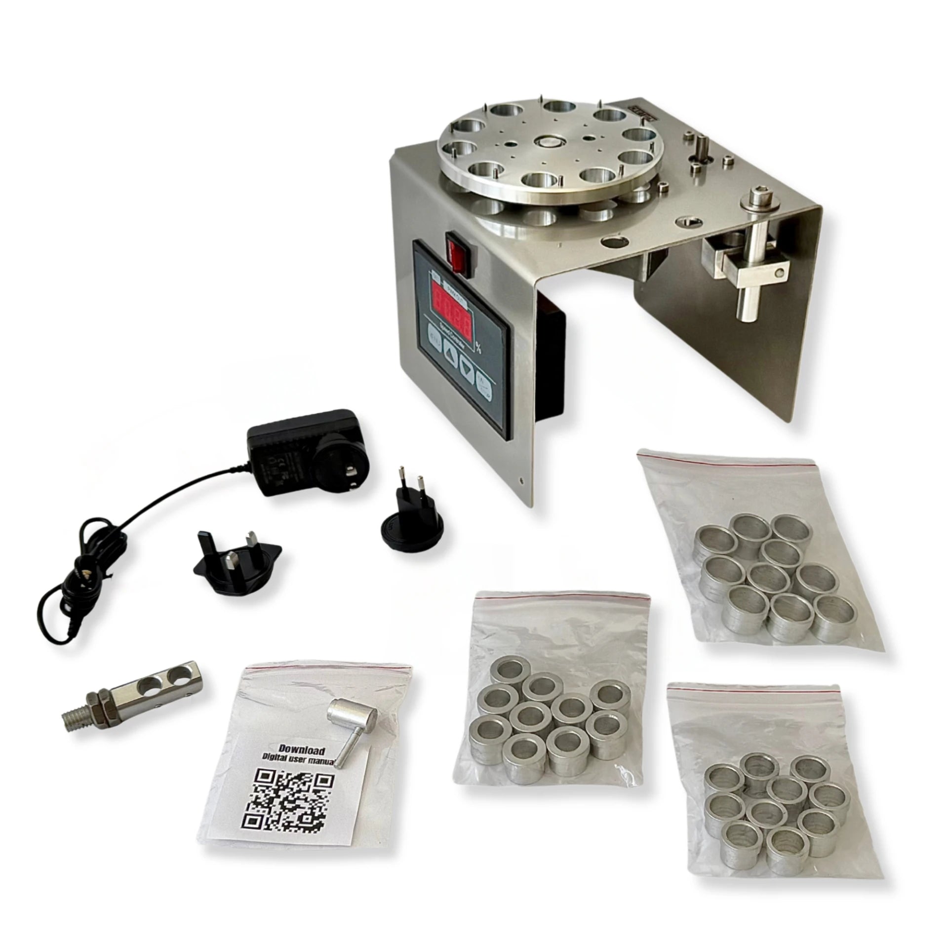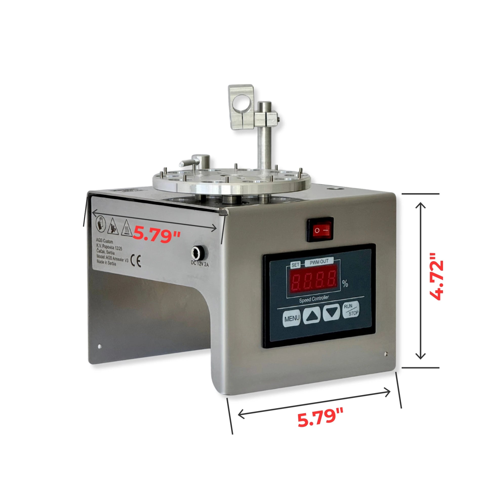 AGS Brass Case Annealer 3.0 – for multiple calibers, with digital PWM controller (adjustable from 2.5 to 10 seconds) and interchangeable inserts, and taller than previous two versions. Three sets of inserts are included – one set is for .223 and alike cases (with .402″ – 10.2 mm opening), one set is for .308 and alike cases (with .492″ – 12.5 mm opening) and one set is for cases with .532 base and alike (with .543″ – 13.8 mm opening). Use without inserts for .338 and alike (.622″ – 15.8 mm opening).